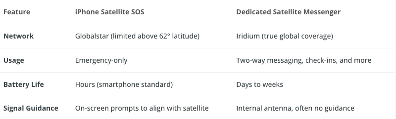 While the iPhone’s satellite SOS is groundbreaking, it’s not a replacement for dedicated satellite messengers like the Garmin inReach or Zoleo. Here’s how they compare:
