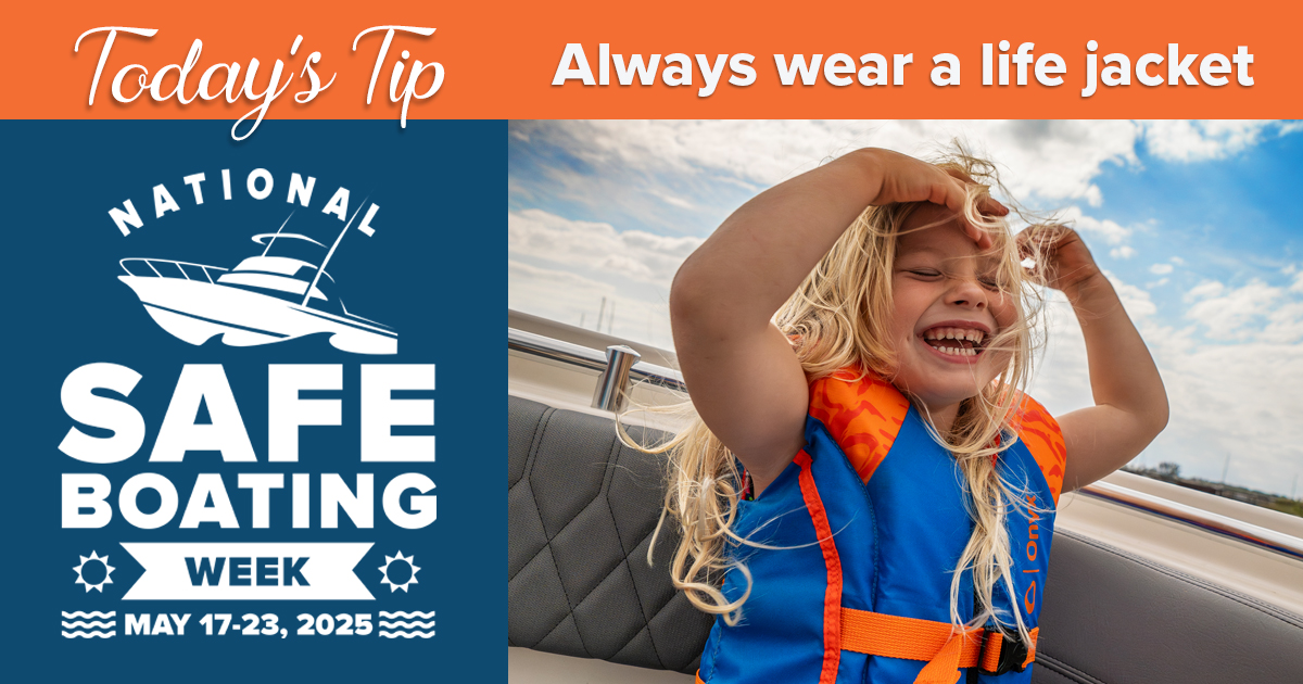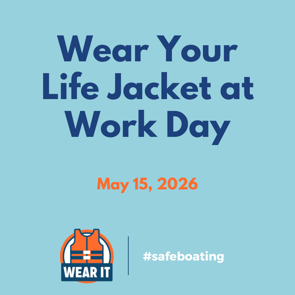 We encourage all boaters to participate in Wear Your Life Jacket at Work Day on May 15, 2026, the day before National Safe Boating Week. No matter where boaters are working, they can join in the fun by wearing their life jacket and posting creative pictures on social media for a chance to win a prize.